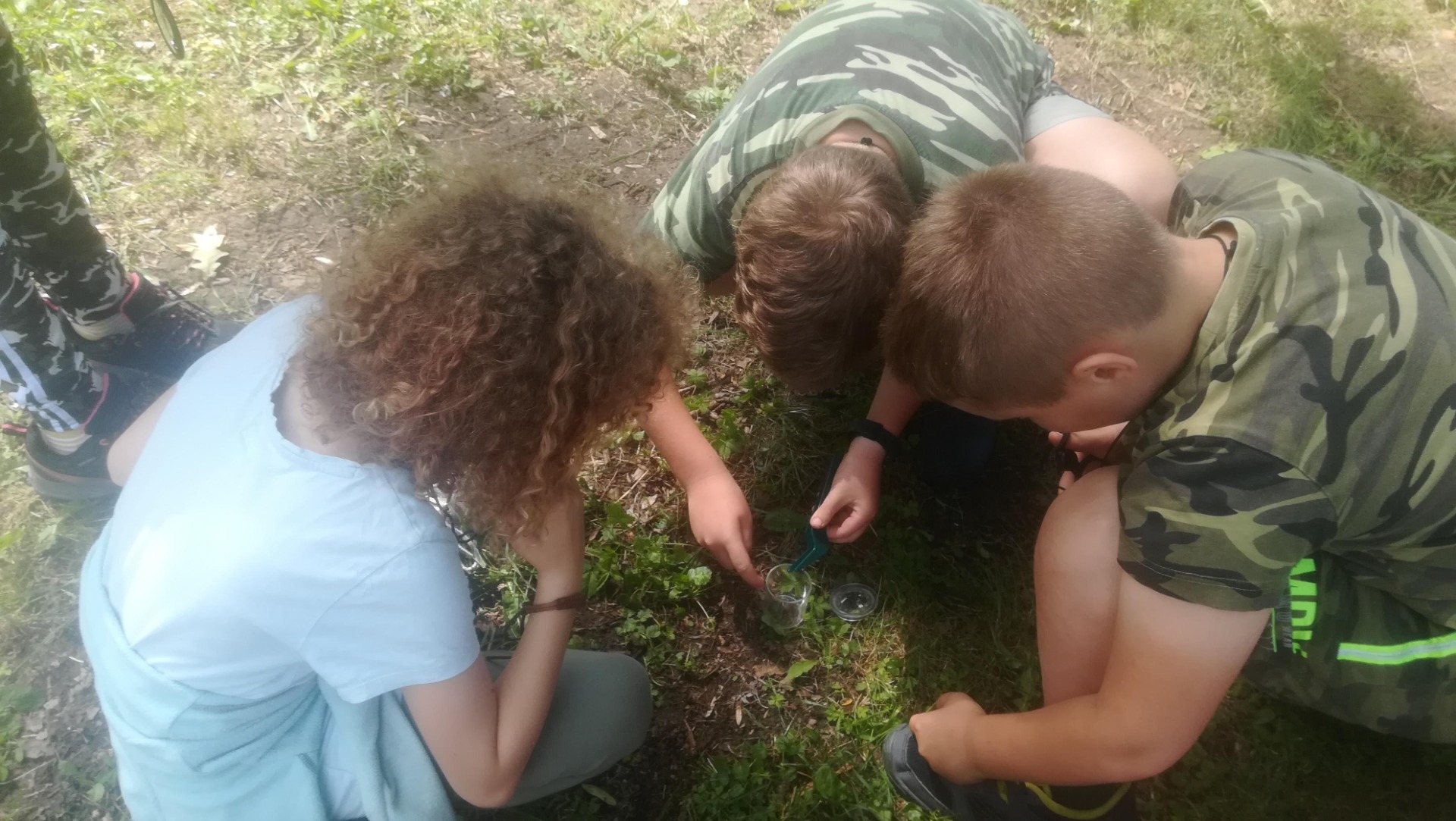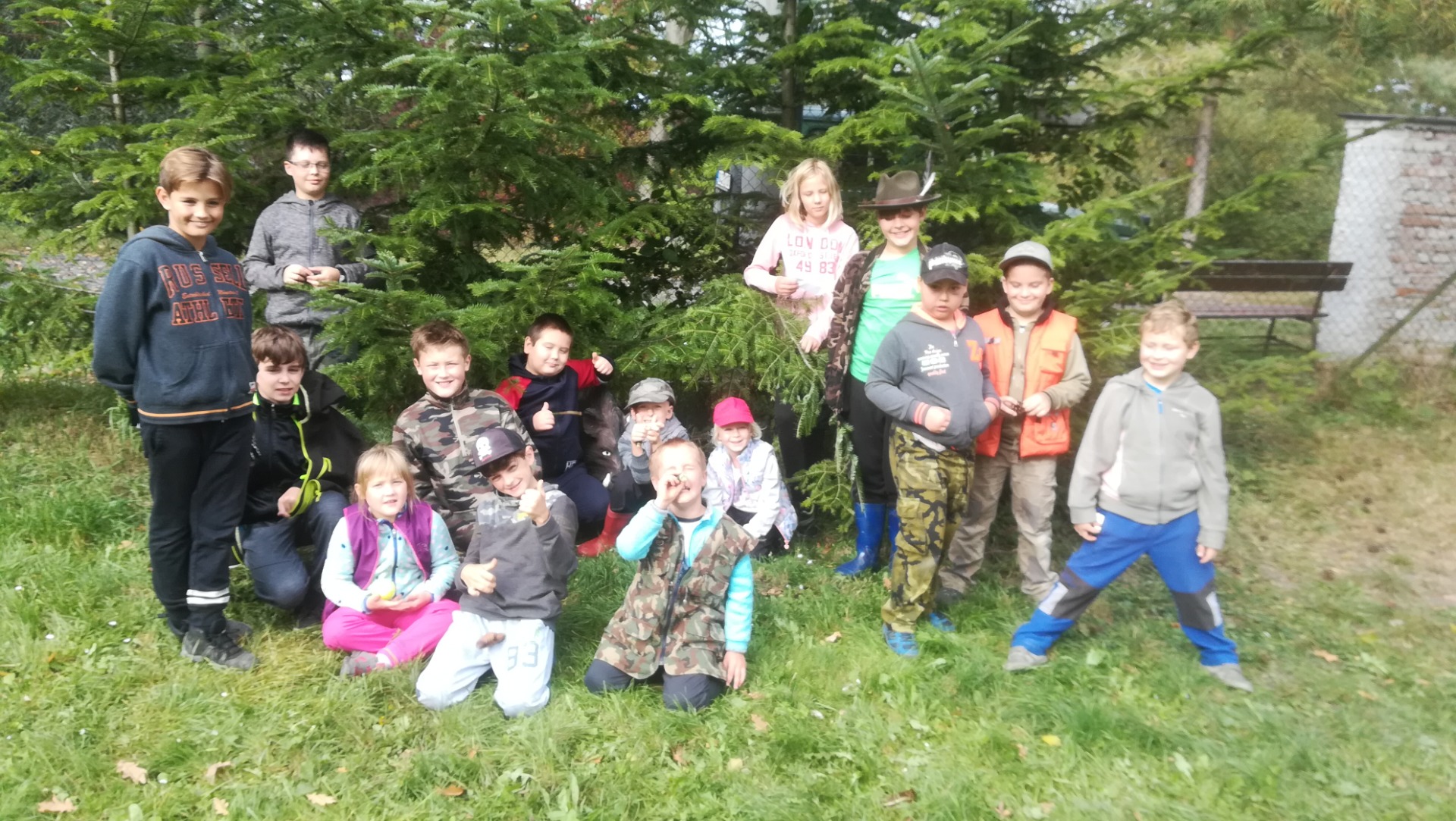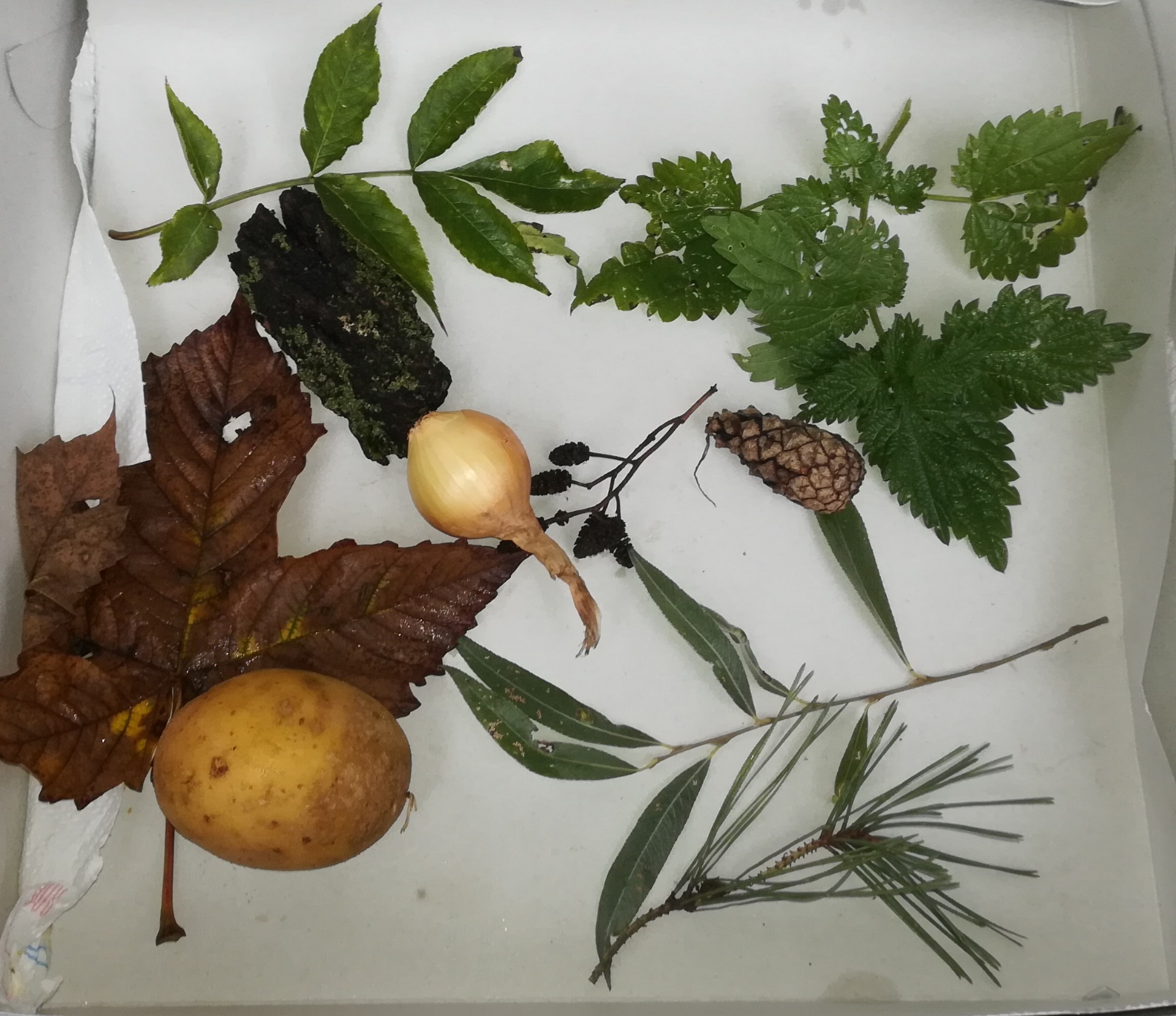 Rostliny: popíchali jsme se o hloch, popálili o kopřivu, pod dubem jsme našli žaludy. Ukázali jsme si borovici, jasan, břízu, smrk, jedli a bez.