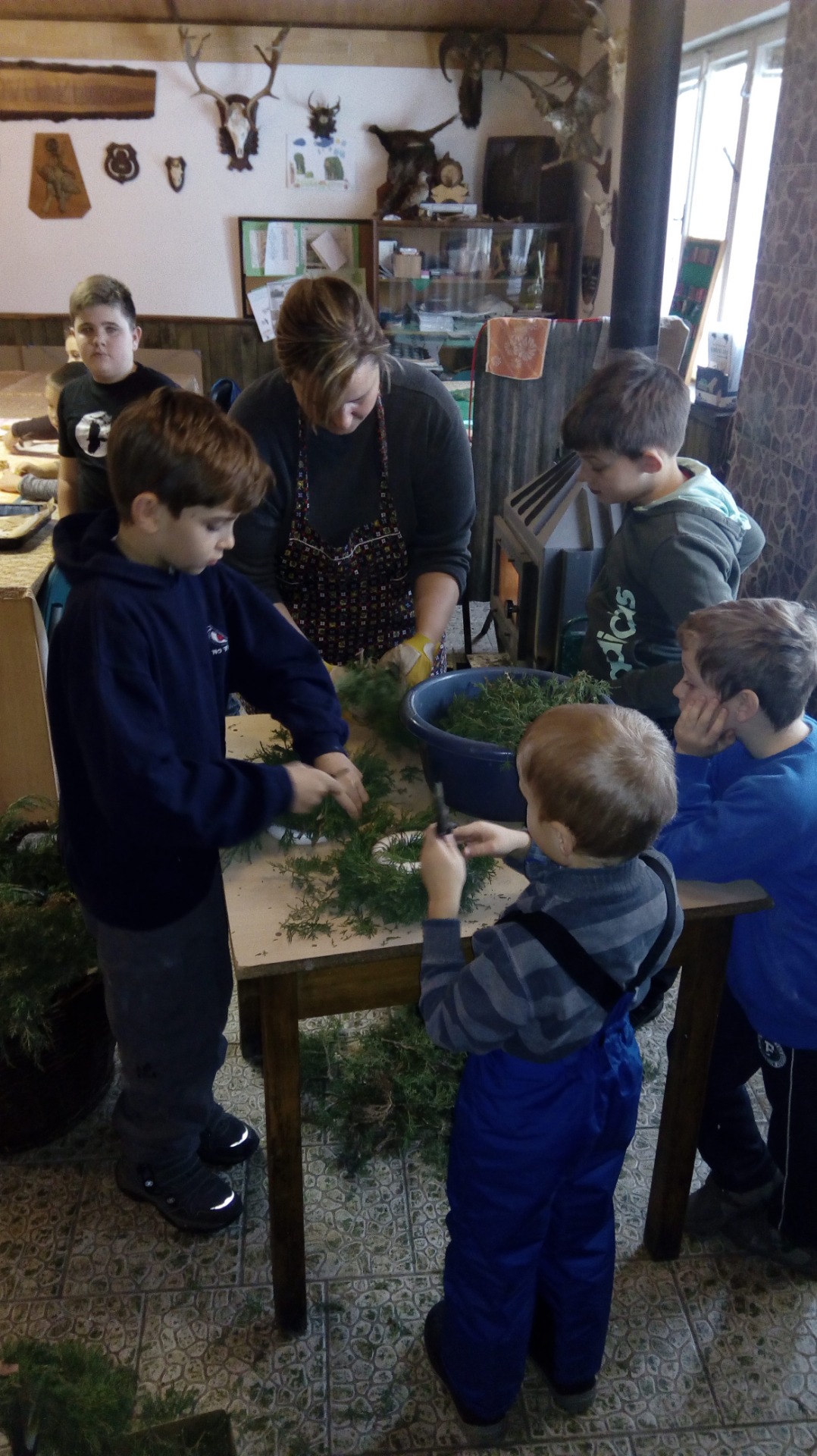 V myslivně jsme pak připravili z loje, slunečnice, prosa a pšenice lojové koule. Ne všem se do nich chtělo, protože ta hmota nevábně voněla. Někteří raději tvořili vánoční myslivecká přáníčka.