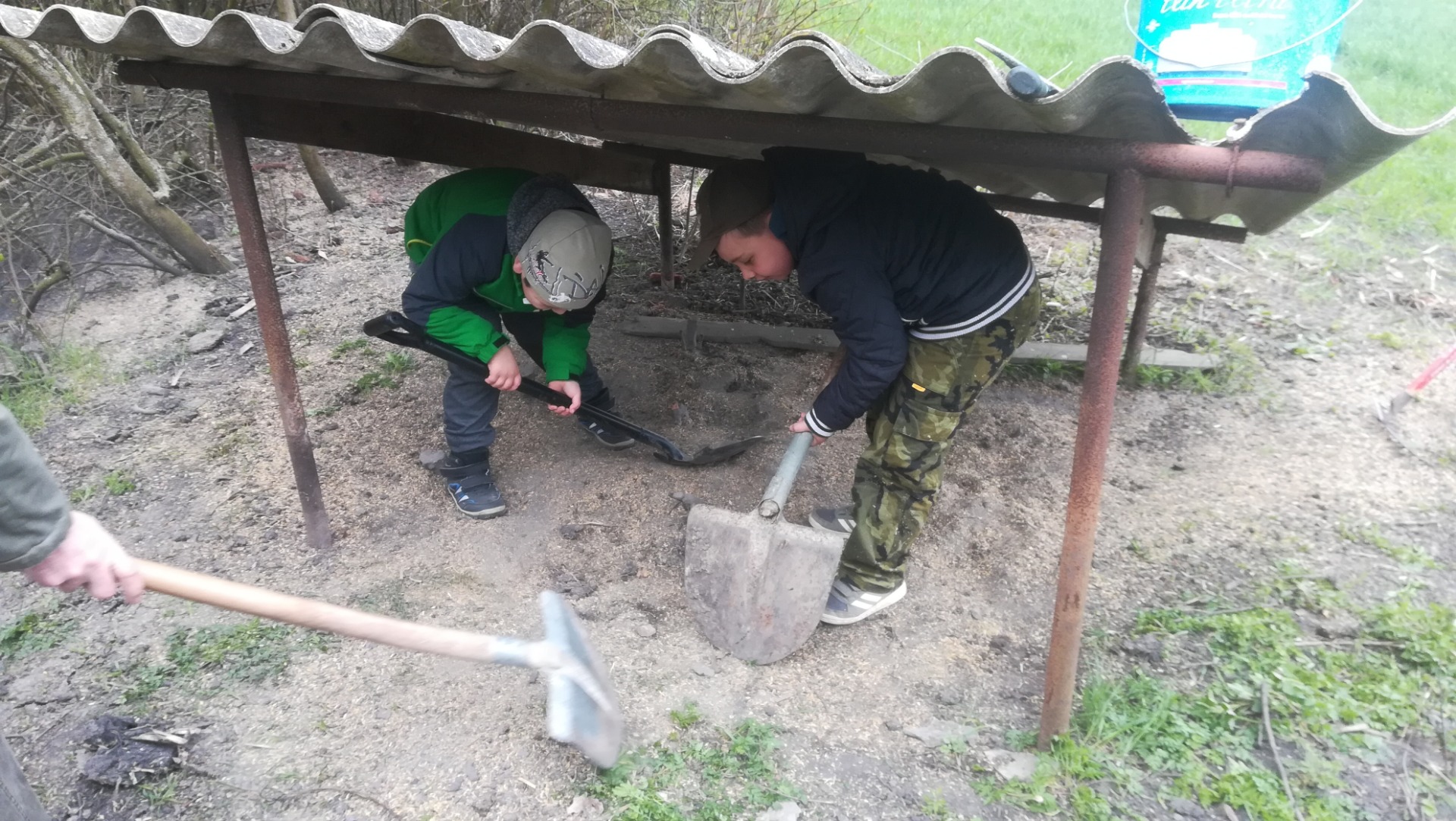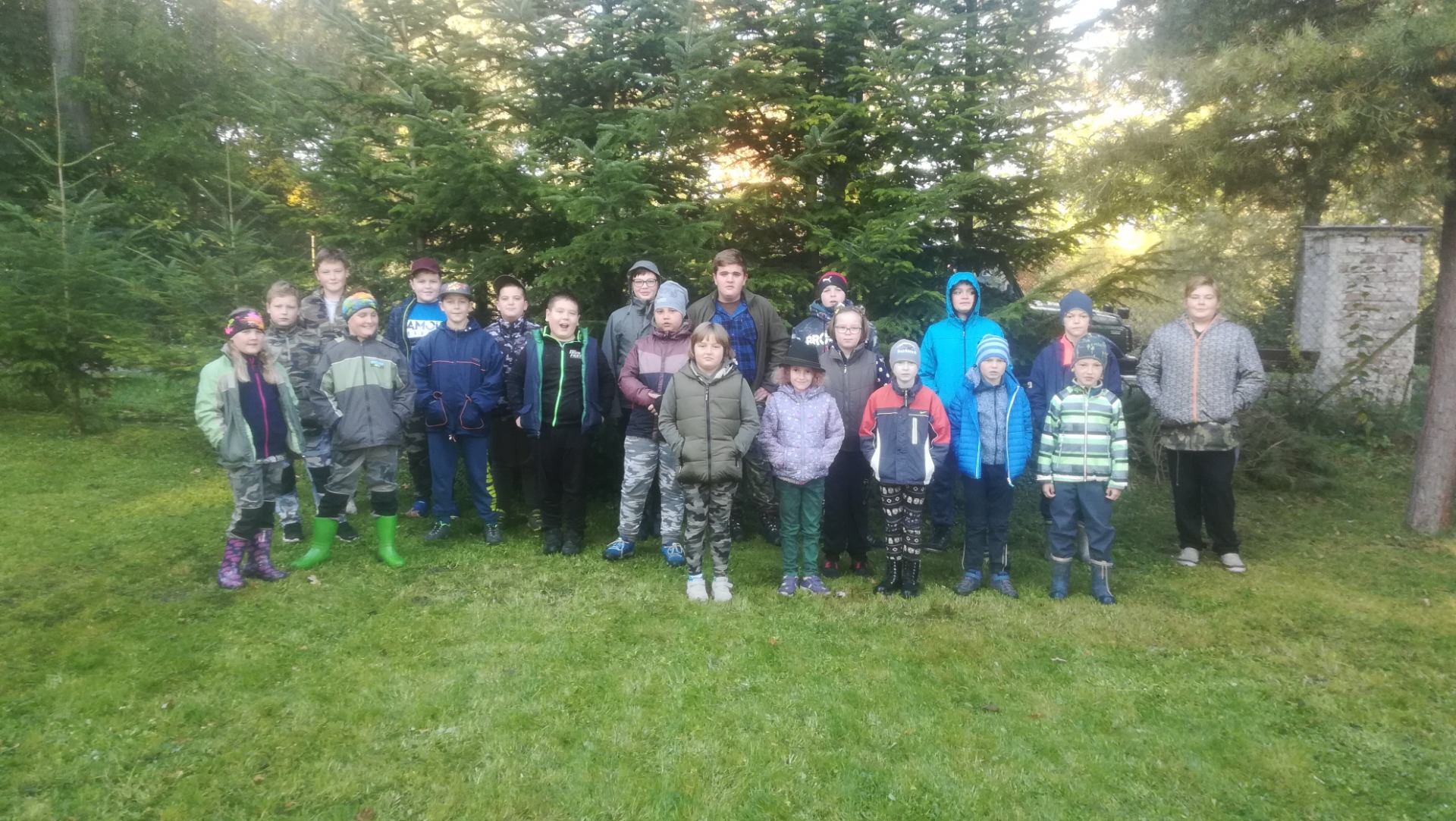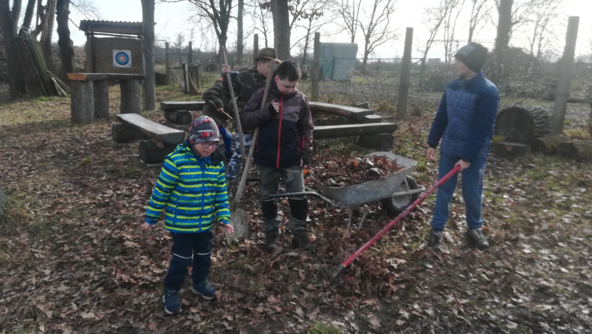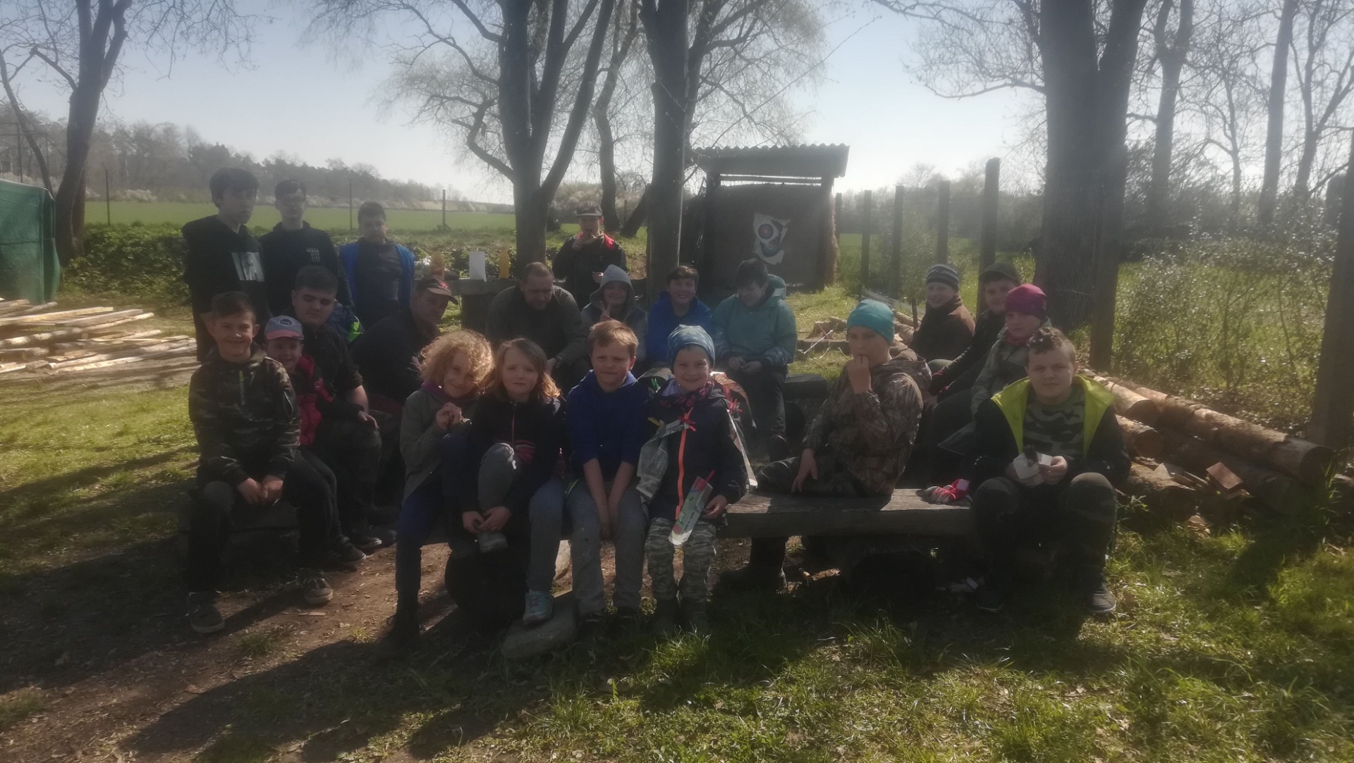 Vyhrabali jsme trávník v myslivně i okolo ní. Nasypali jsme obilí pod oba zásypy u myslivny, protože tam chodí hodně bažantů. Natřeli jsme dvě lavičky. Stříleli jsme z luku a hráli na "bažanta". Na závěr jsme si opekli špekáčky, které nám v myslivně zůstaly po včerejší besedě pro ZŠ Budiměřice.