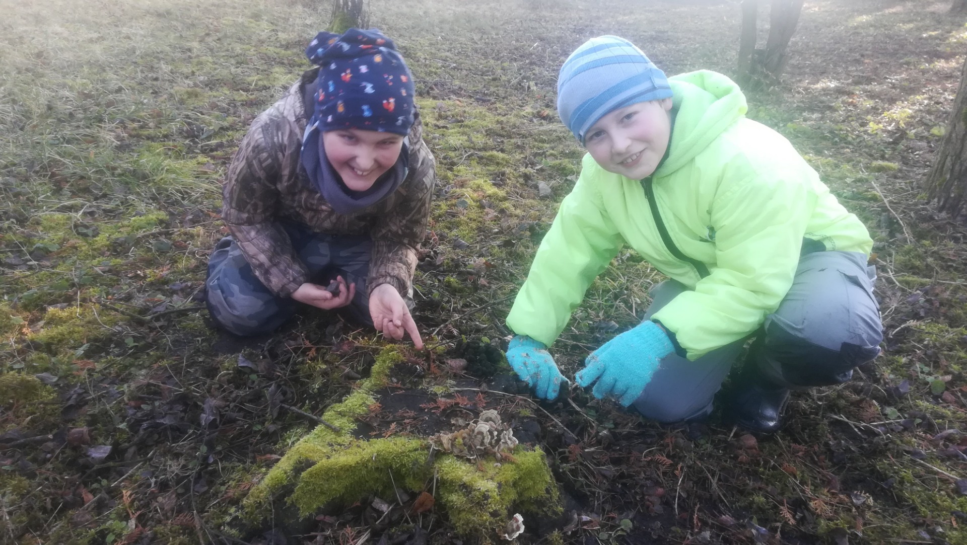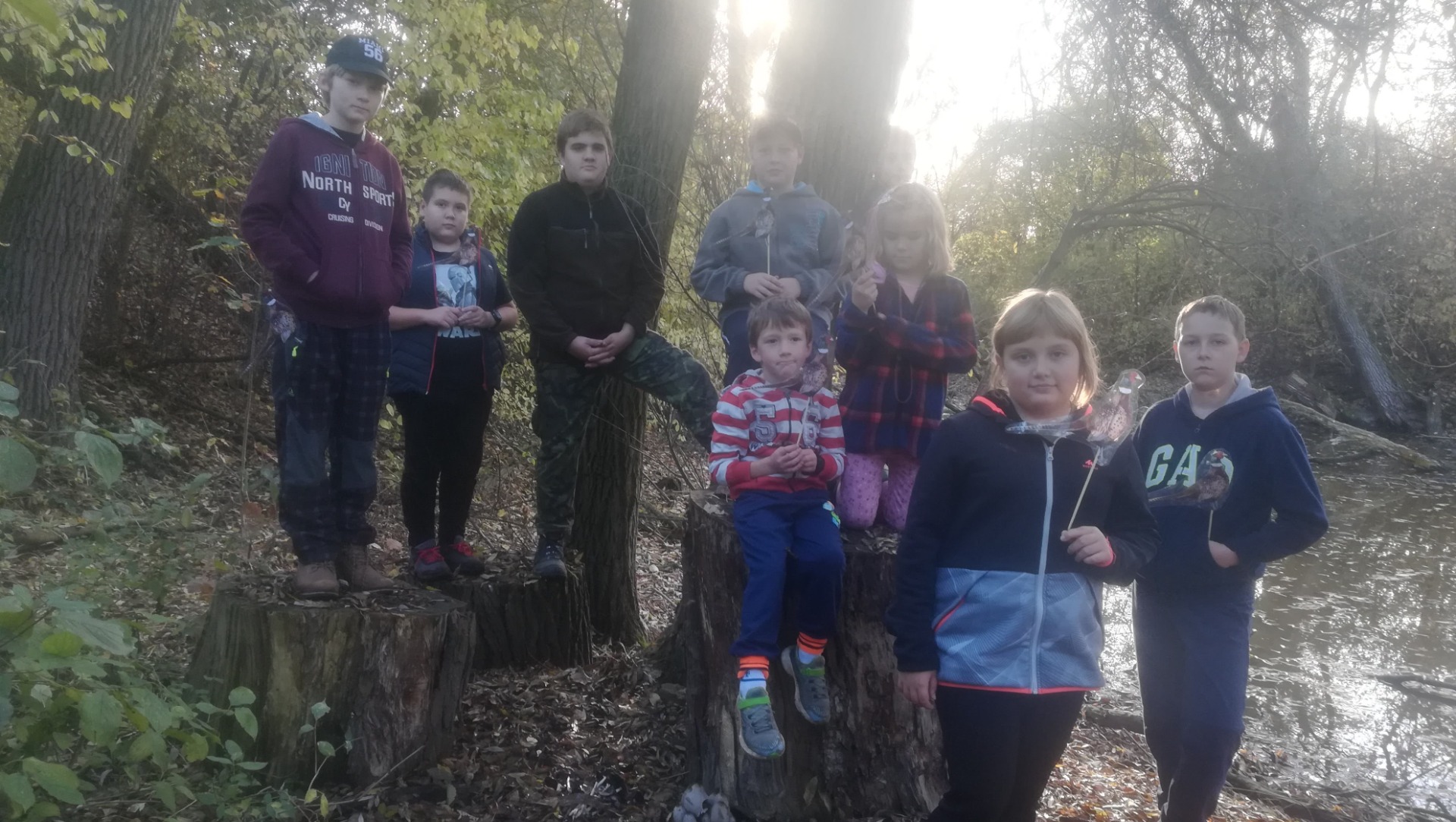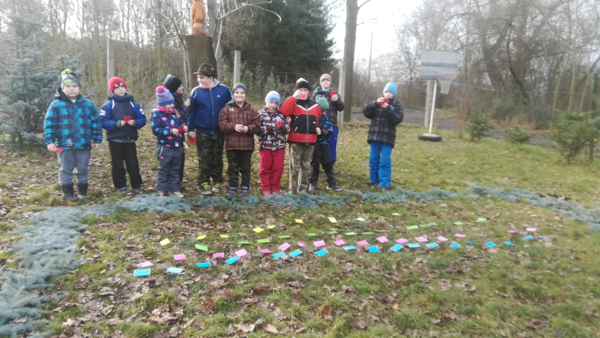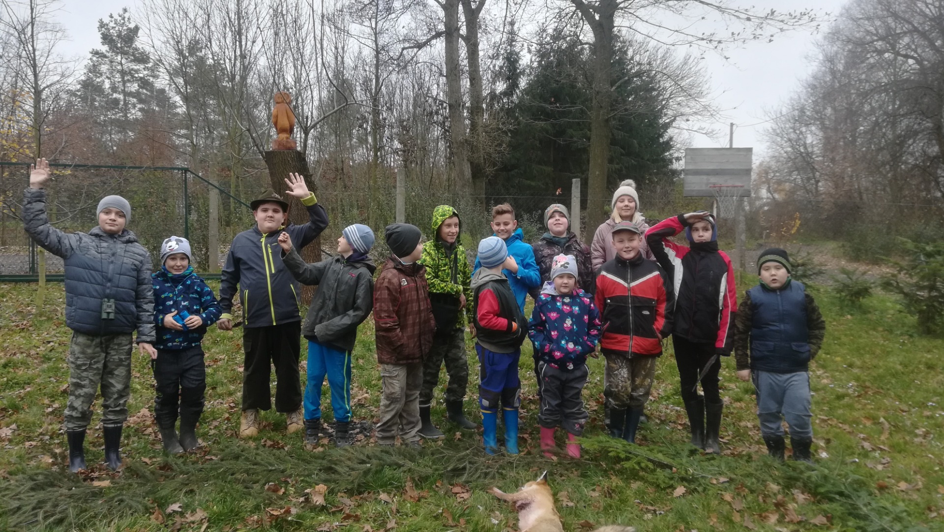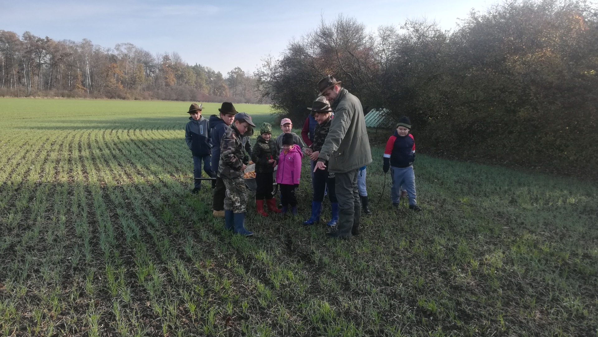 Při příchodu seznámení s některými dospělým členy MS Křečkov, kteří měli brigádu. Povídání o listopadu, co se děje v okolo nás, co dělají myslivci, sv. Hubert. Vyzkoušení čtyřkolky od Luďka, ukázka krmného zařízení od Martina. Zasypání na Skále a pod zásyp za myslivnou. Hry "zvířecí hlasy" a "liščí ocásky". Plemena některých loveckých psů, naučení básničky o kokršpanělovi od Martina.