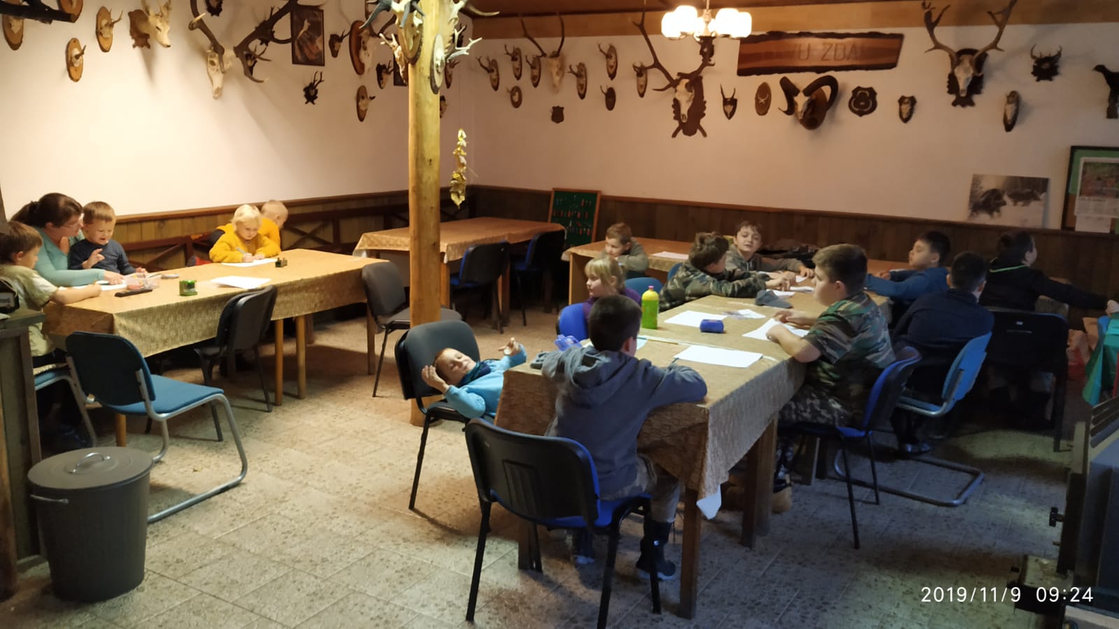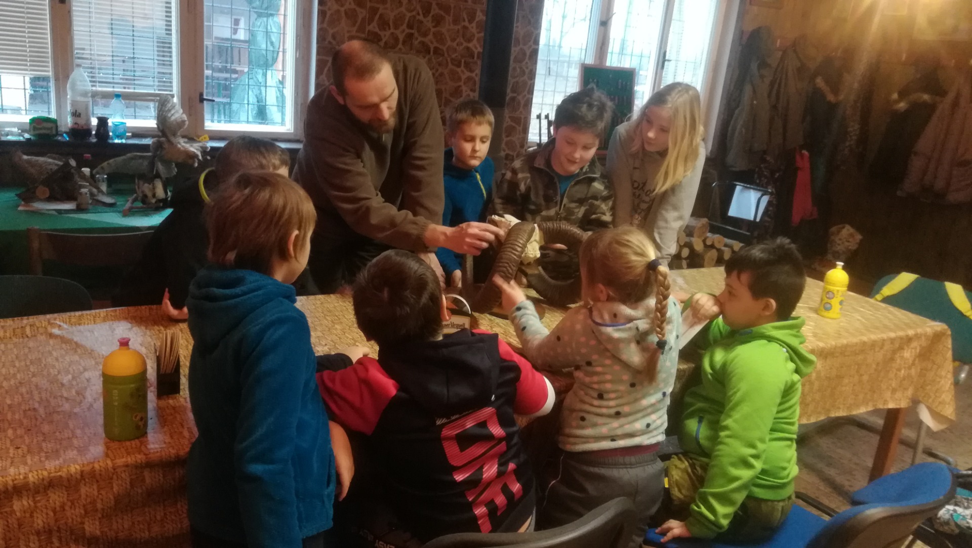 Nejdříve v myslivně trochu hravého "učení" - poznávání stromů, určování zvířat dle druhu přijímané potravy, co patří a nepatří pod krmelec, učení rostlin a zvířat díky obrázkovým hrám domino, nově kdo a kde bydlí.