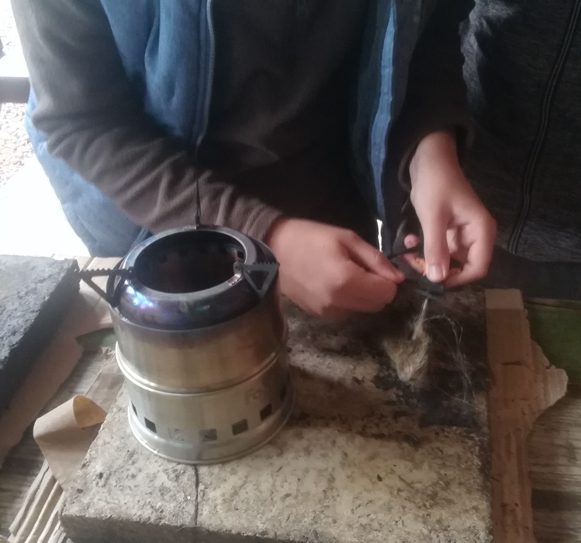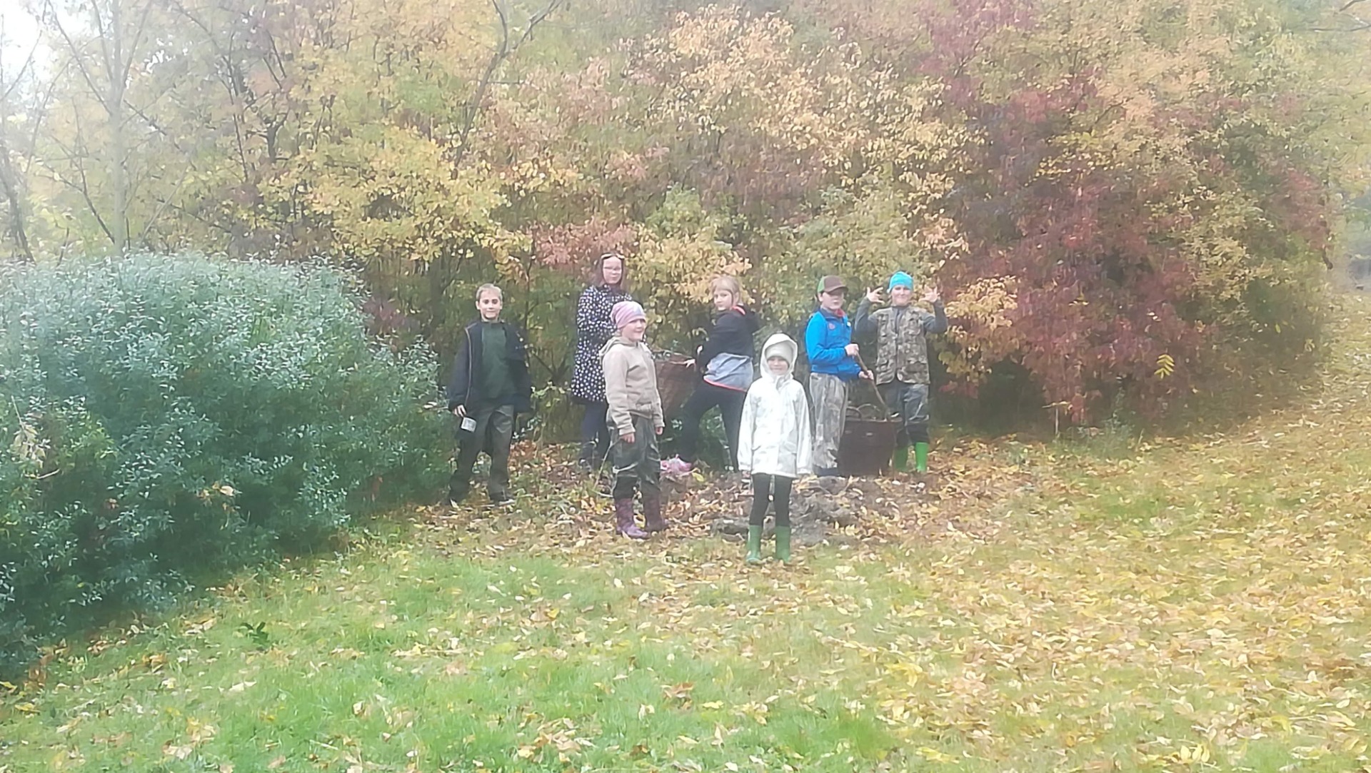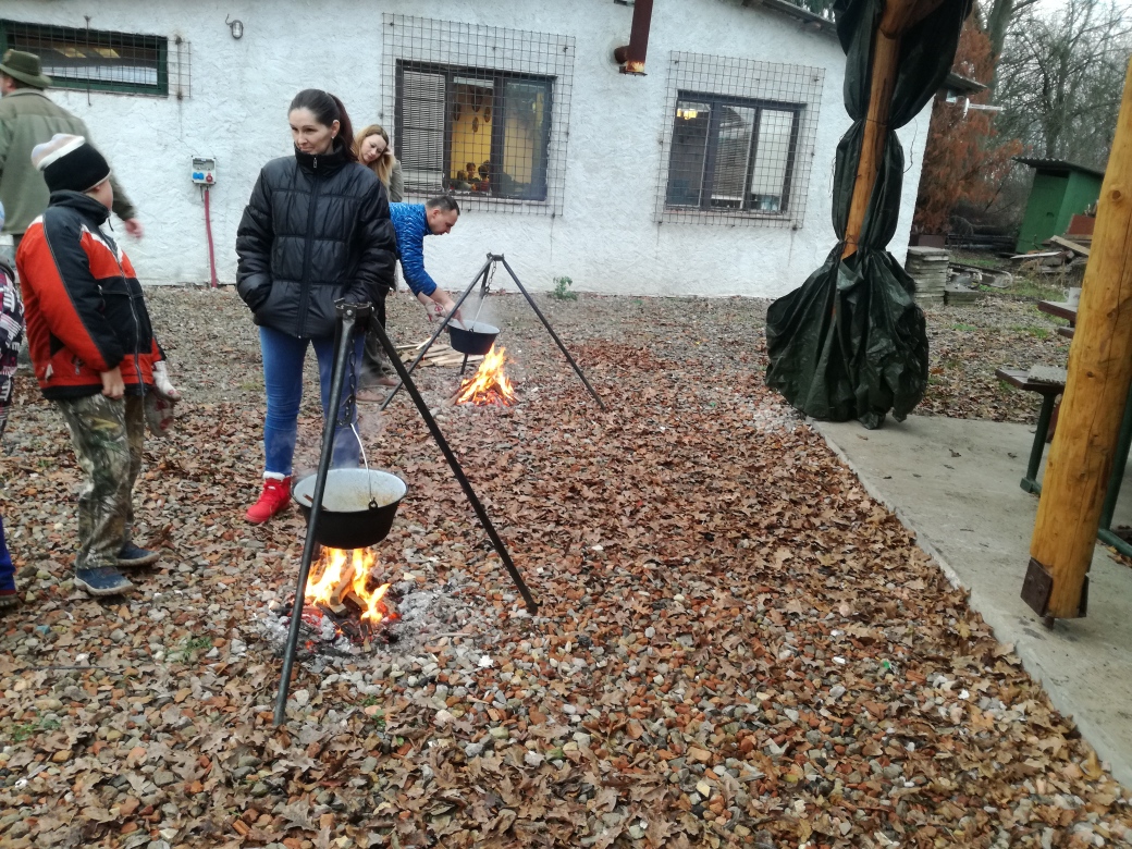 Hela nám ostříhala živé ploty z ptačího zobu okolo myslivny. Ostříhané větve jsme uklízeli. Při tom jsme rozdělali oheň pod kotlíkem a vařili guláš ze zvěřiny. Ještě jsme zvládli naaranžovat dýničky pomocí přírodnin.