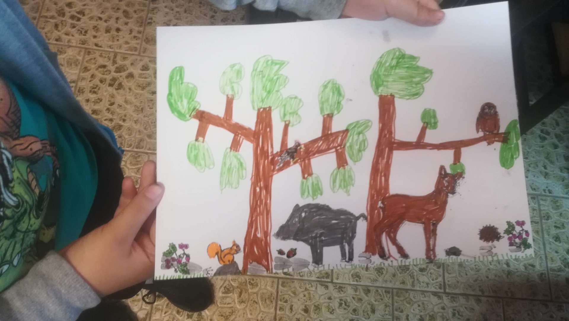 Opakování popisu zvířat, poznávání keřů a stromů. Rozdíl mezi kulovnicí a brokovnicí, kulovým a brokovým nábojem, popis kulovnice. Malování obrázků do 0. ročníku soutěže "Myslivost a ochrana přírody - očima dětí".