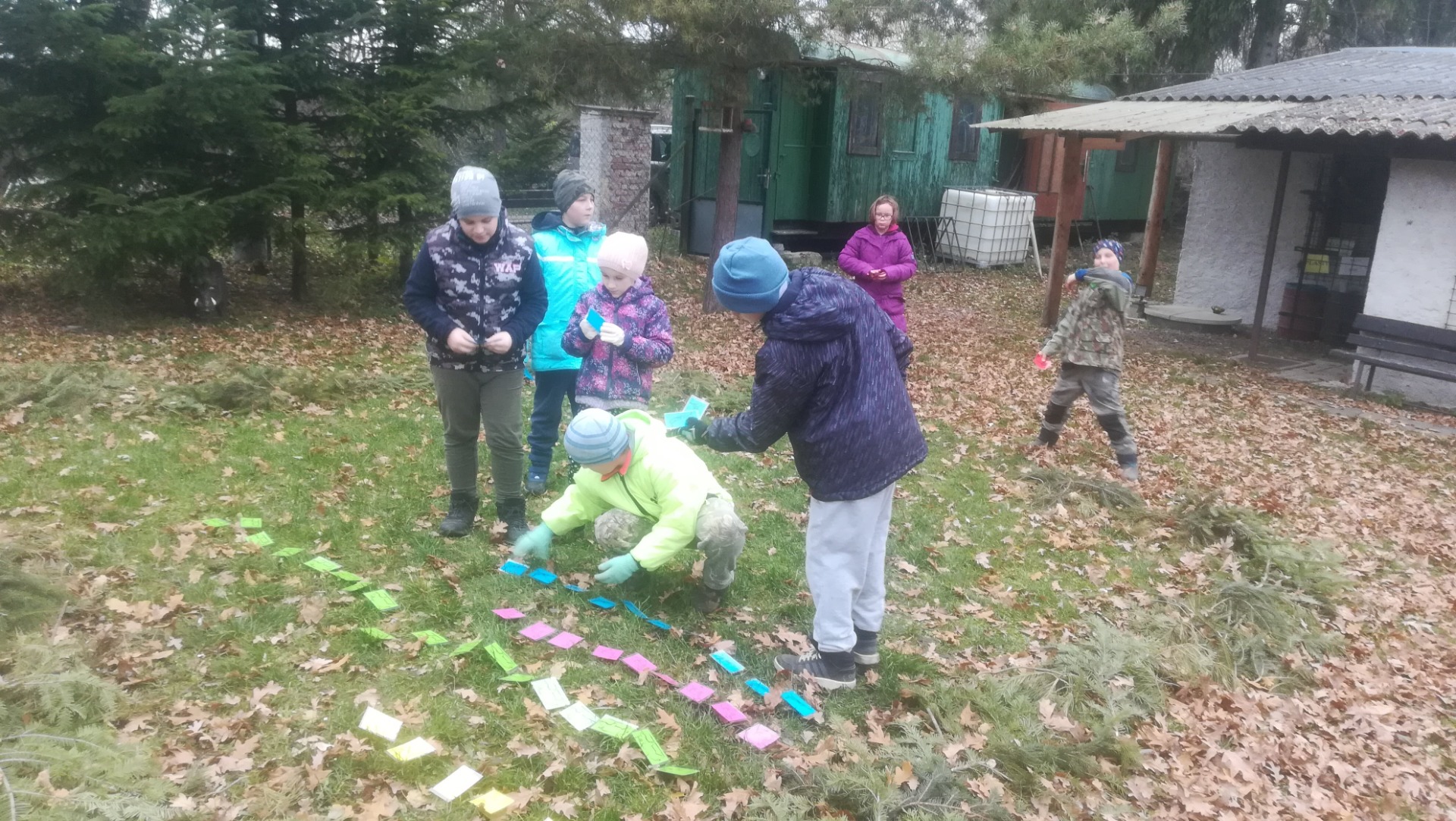 Domino, rozdělení zvířat podle přijímané potravy, dřeviny, hrabání, natírání laviček, krmení pod zásypy, opékání špekáčků, luky a bažant.